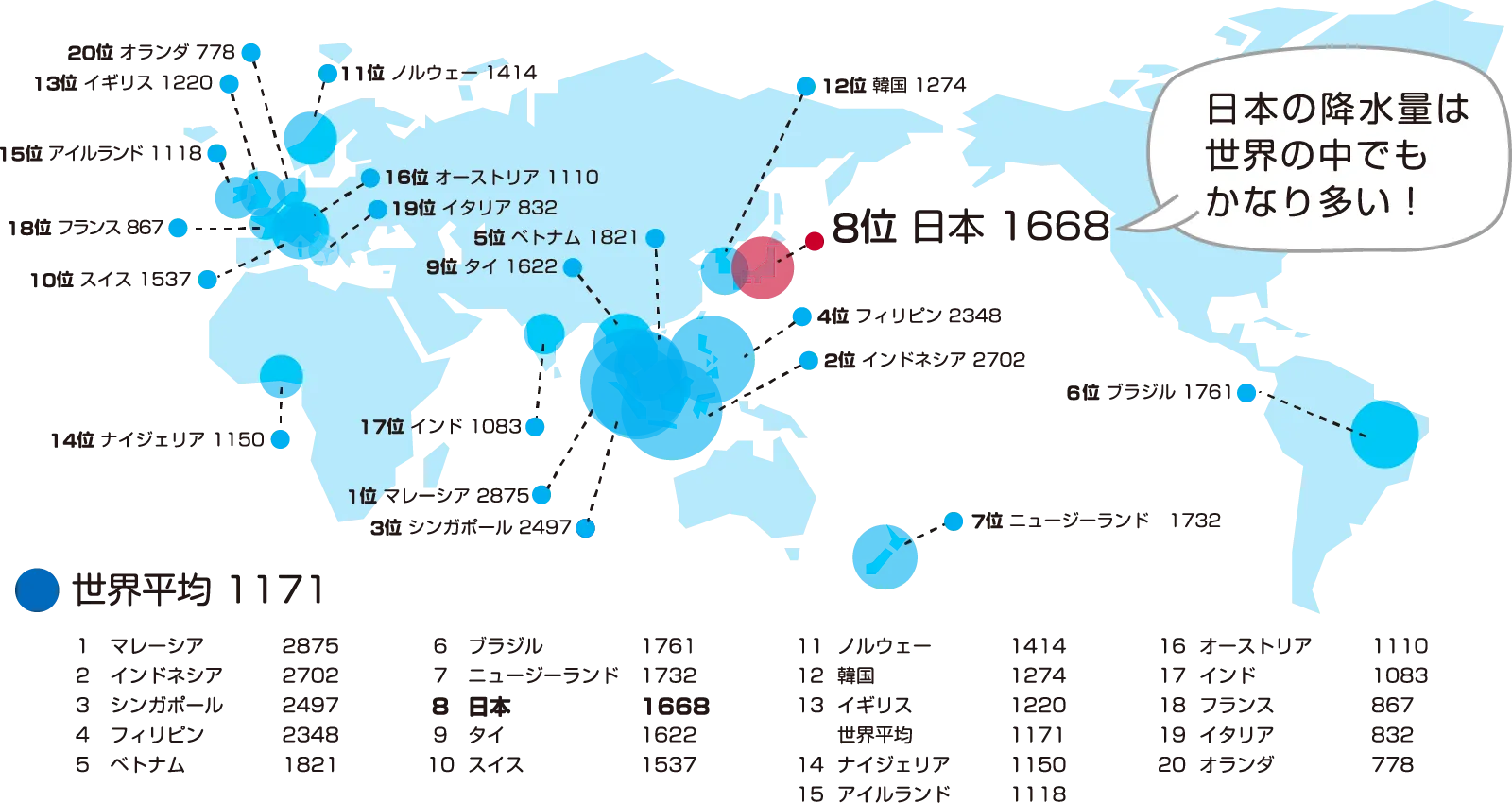 世界の降水量上位20カ国(1991〜2020年の30年間の平均降水量)