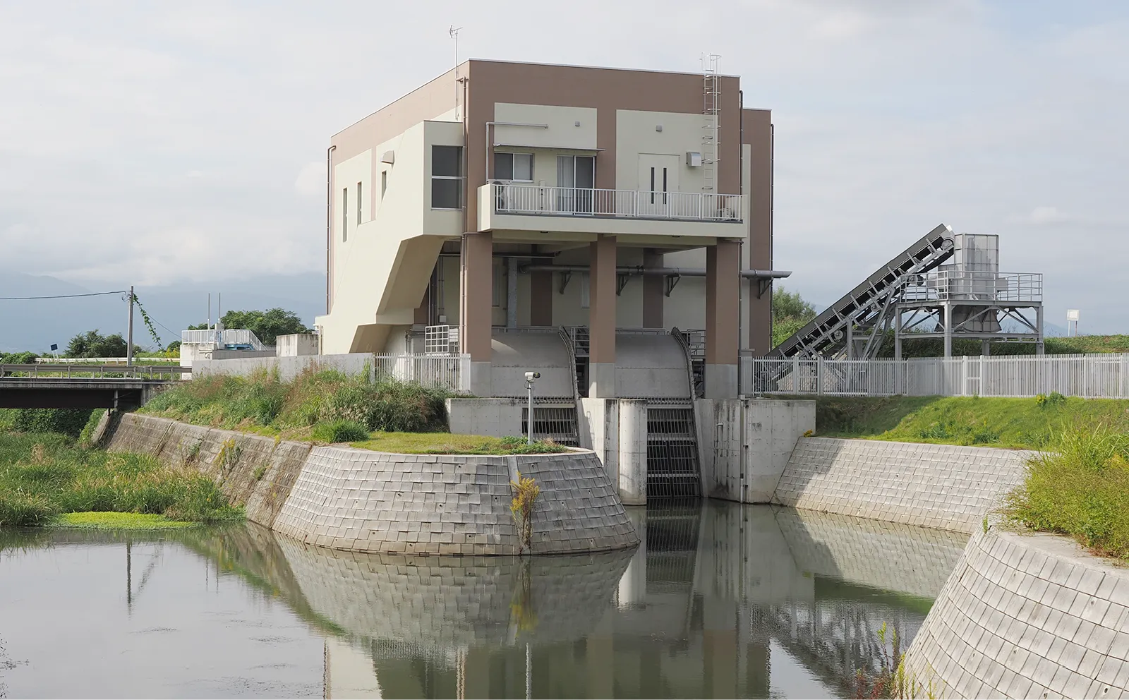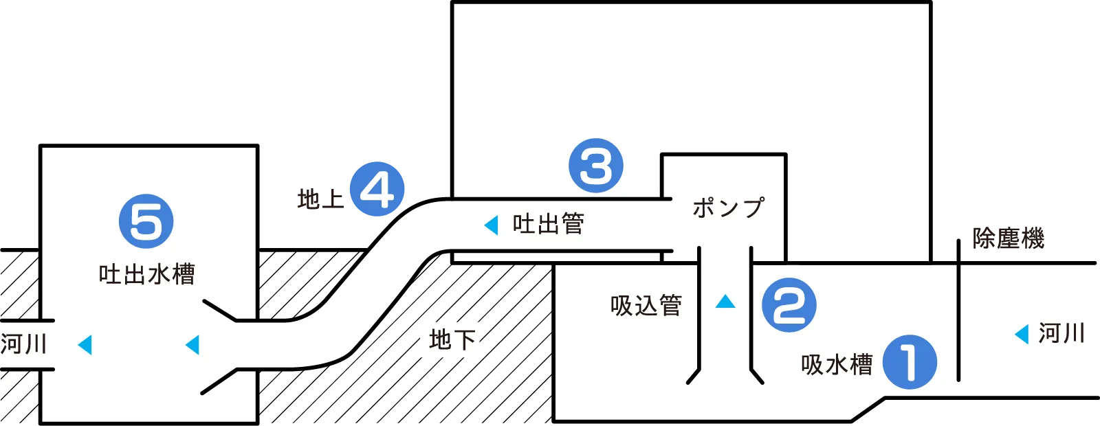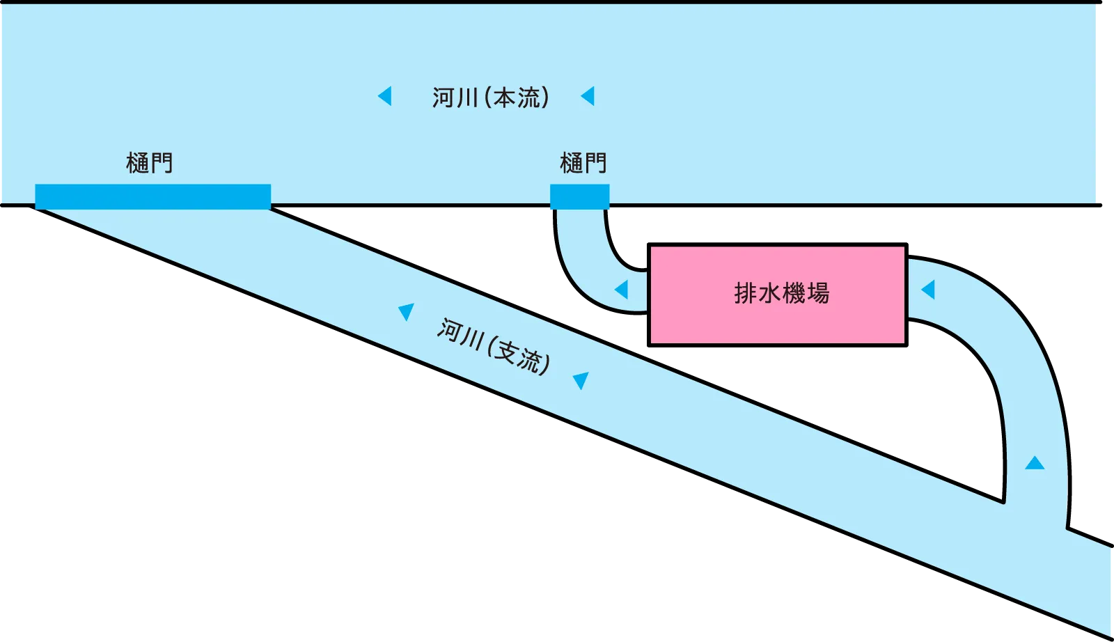 河川には本流と支流があります。 雨量が増加した時、本流よりも早く支流の水が溢れ、本流から支流に向かって水が逆流します。 その時、排水機場の強力なポンプを使って、支流から本流へ、溢れた水を強制的に排出します。 これが基本的な排水機場の役割です。 このほかに、排水路が河川より低い場合に常時稼働している排水機場や、農業用水目的や下水処理場へ汚水を運ぶためのものもあります。